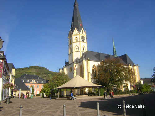 St. Laurentiuskirche (1269–1300 errichtet) mit Weinbergen im Hintergrund